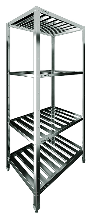 Кухонный стеллаж Restoinox СТПР-9/3-ЭН предназначен для хранения посуды, инвентаря и продуктов, не требующих специального температурного режима, на предприятиях общественного питания и торговли. Модель оснащена 4 регулируемыми по высоте полками-решетками. Разборный каркас выполнен из уголка 40х40 мм нержавеющей стали AISI 430, полки - из нержавеющей стали AISI 430. Дополнительные характеристики:
