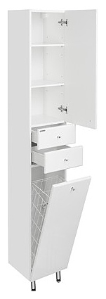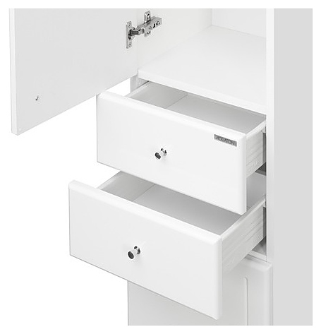Напольный пенал AQUATON Минима М 1A132303MN01L выполнен в современном стиле, декорирован фрезеровкой с плавными симметричными линиями и благодаря лаконичному дизайну отлично дополнит интерьер любой ванной комнаты. Напольная конструкция обеспечивает легкий монтаж и не требует специального ремонта в помещении. Модель оснащена фасад-створкой, за которой находятся полки, регулируемые по высоте, двумя небольшими выдвижными ящиками и откидной фасад-створкой с бельевой корзиной в нижней части пенала. Корпус изделия выполнен из влагостойкой ЛДСП, а фасады из высококачественной МДФ и окрашены в белый цвет с высокой степенью глянца полиэфирной краской ультрафиолетового отверждения, которая обеспечивает изделию привлекательный внешний вид, а также износостойкость и долговечность. Комплектация: