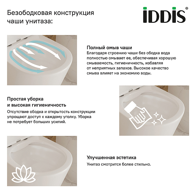Унитаз подвесной с сиденьем IDDIS CALIPSO CALRDSEi25 выполнен в современном стиле модерн, имеет прямоугольную форму чаши. Благодаря подвесной конструкции унитаз не занимает много места в помещении, а свободное пространство под чашей делает уборку в ванной комнате гораздо легче. Безободковое исполнение позволяет предотвратить скопление бактерий и грязи на внутренней поверхности чаши и обеспечивает ее чистоту и гигиеничность использования. Быстросъемная конструкция облегчает обслуживание этого сиденья за счет фиксации на месте быстроразъемным шарниром. Встроенный механизм мягкого закрывания Soft Close не дает сиденью резко опускаться, обеспечивая бесшумное использование, и предотвращает появление трещин, царапин и сколов на изделии. Унитаз выполнен из санфарфора, который обладает повышенной прочностью и устойчивостью к негативным внешним факторам, а так же долгое время сохраняет идеальную белизну и не впитывает запахи и грязь. Комплектация: