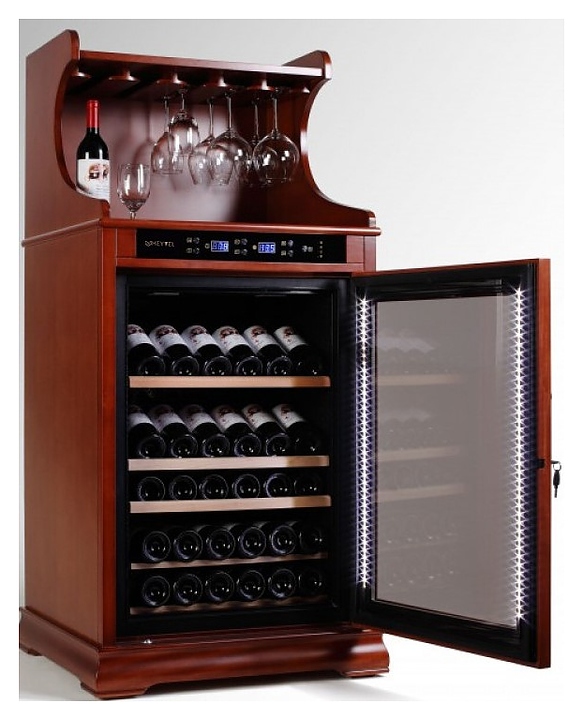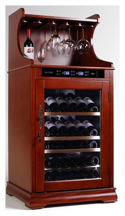 Винный шкаф MEYVEL MV46-WM1-BAR1.4-C предназначен для демонстрации, хранения и создания оптимальных условий для сохранения всех вкусовых свойств вина в бутылках на предприятиях общественного питания, торговли, в барах, ресторанах, специализированных магазинах, частных домах или квартирах. Модель оснащена электронной панелью управления, электронным термостатом и светодиодной подсветкой. Корпус выполнен из обшитой деревом стали, дверь - из деревянной рамы и тройного стекла с защитой от ультрафиолетовых лучей, полки - из массива бука, ручка двери - из стали. Особенности: