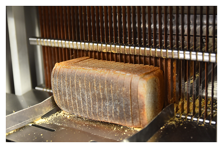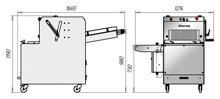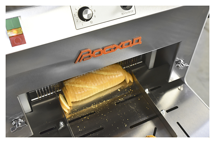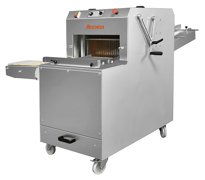 Хлеборезка Восход КАЙМАН 2M используется в пекарнях, кондитерских и на предприятиях пищевой промышленности для быстрой и качественной нарезки различных сортов и форм хлеба и хлебобулочных изделий кусочками в большом количестве. Механизм резки имеет рамочную конструкцию. Продукт вручную укладывается на приемный транспортер и, при помощи прижимного транспортера, поступает в зону резки. Резка продукта осуществляется за счет встречного возвратно-поступательного движения двух рамок с установленными в них ножами с тефлоновым покрытием. Из зоны резки порезанный на ломтики продукт поступает на приемный стол и вручную перемещается на упаковку. Облицовка корпуса хлеборезки выполнена из нержавеющей стали. Особенности: