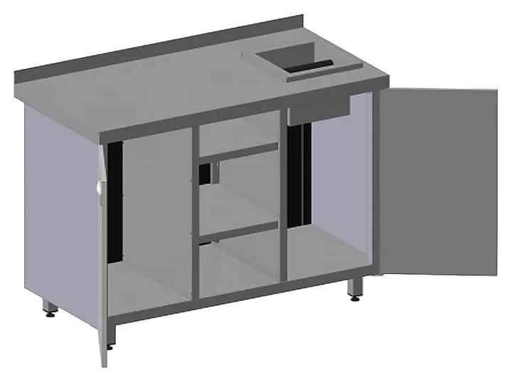 Барная станция для кофемашин Restoinox БСНКР-12/7-БП с нок-бокс предназначена для организации барного места на предприятиях общественного питания и торговли. Модель оснащена распашными дверями, бортом и 2 сплошными полками. Разборный корпус, полки и столешница выполнены из нержавеющей стали AISI 430, задняя стенка - из оцинкованной стали. Столешница усилена листом ЛДСП. Дополнительные характеристики: