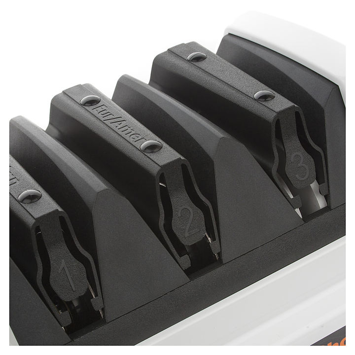 Электрическая точилка Chefs Choice CC1520W предназначена для заточки ножей на предприятиях общественного питания и торговли, в частных домах и квартирах. Модель оснащена усовершенствованной системой пружинных направляющих Spring Guide System, которая обеспечивает точный контроль угла подвода лезвия к абразивам. Прогрессивная система подпружиненных направляющих позволяет правильно затачивать практически все ножи, включая модели с толстым обухом. Особенности: