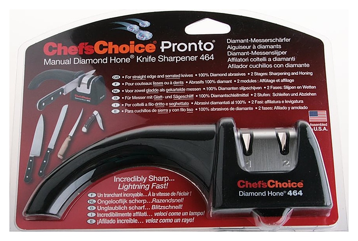 Механическая точилка Chefs Choice CC464 предназначена для заточки ножей на предприятиях общественного питания и торговли, в частных домах и квартирах. Технология заточки Chef’sChoice CrissCross предусматривает использование алмазных абразивных кругов, которые одновременно затачивают лезвие с двух сторон, вращаясь на встречных направлениях. В грани схождения спусков клинка края линии заточки объединяются, образуя движение «крест-накрест», с помощью которого формируются микроскопические зубцы. Модель оснащена эргономичной ручкой Soft Touch для легкого и надежного удержания и резиновыми ножками противоскольжения. Особенности: