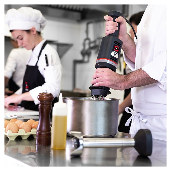 Ручной миксер Sammic MB-21 предназначен для взбивания, смешивания, измельчения продуктов питания на предприятиях общественного питания и торговли. Модель оснащена регулятором скорости, световым индикатором подключения к электросети и эргономичной противоскользящей ручкой. Y-образный нож с долговечной режущей кромкой выполнен из закаленной стали. Особенности: