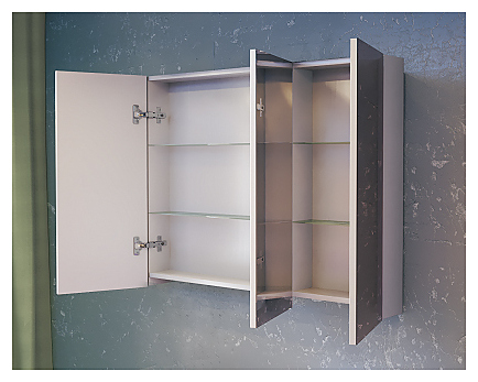 Зеркальный шкаф Raval Great 100 выполнен в стиле модерн и позволяет эффективно задействовать пространство в небольшой ванной комнате. Модель оснащена 4 стеклянными полками и 3 зеркальными дверцами. Корпус и фасад выполнены из ЛДСП и покрыты белой краской, предназначенной для использования во влажных помещениях, что обеспечивает изделию привлекательный внешний вид, а также износостойкость и долговечность. Особенности: