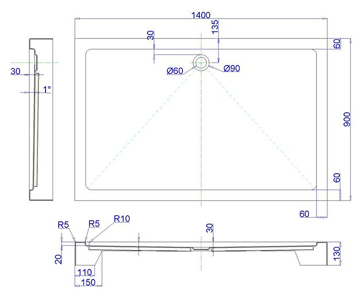 Поддон душевой в сборе Royal Bath RB9140HP 140х90х13 см, акрил, низкий