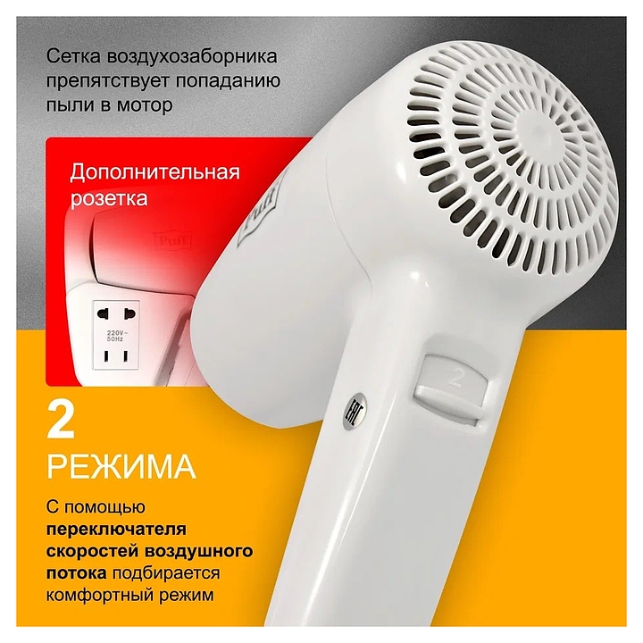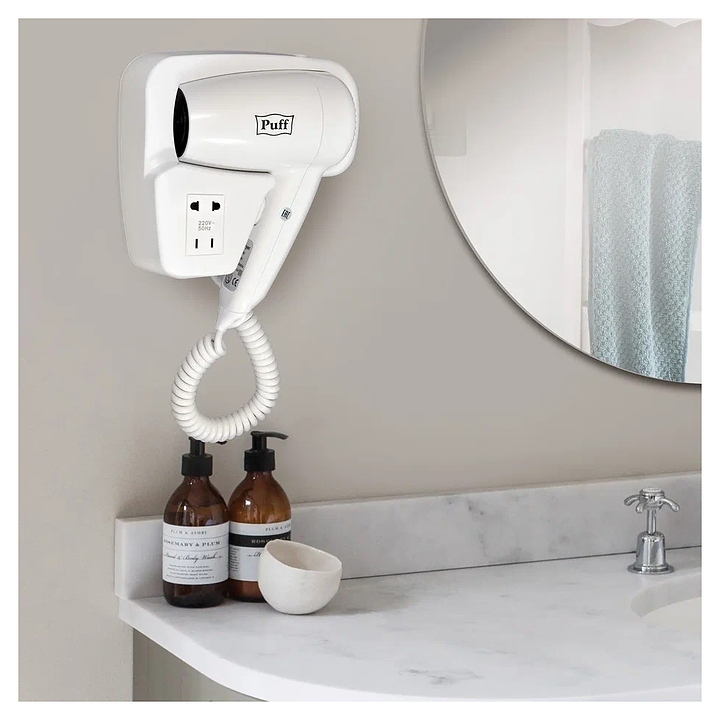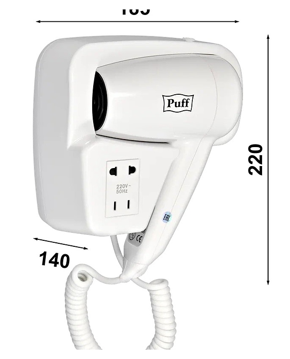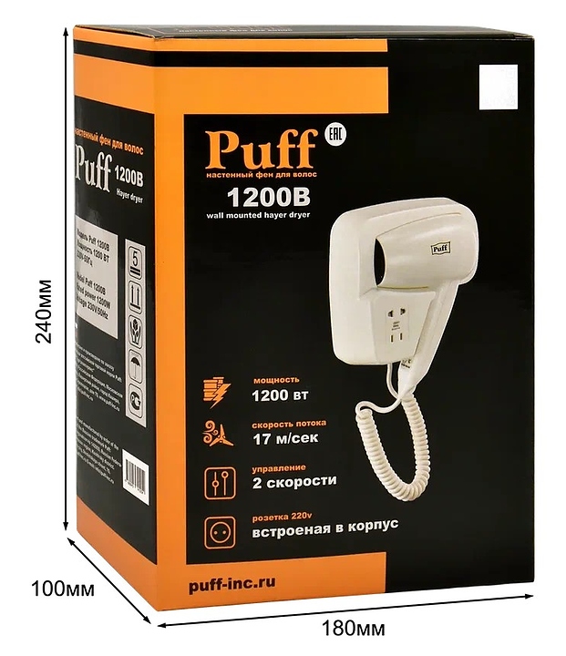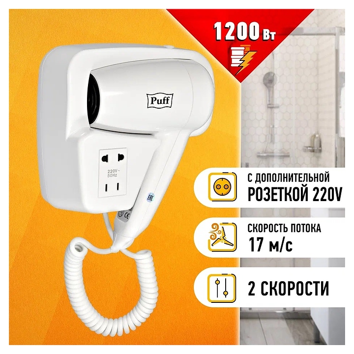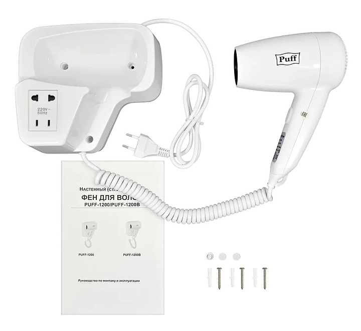Настенный фен Puff 1200B предназначен для быстрой сушки и комфортной укладки в спорткомплексах, фитнес-центрах, бассейнах, отелях, гостиницах, частных домах и квартирах. Модель оснащена кнопкой включения и выключения, дополнительной розеткой, 2 режимами сушки по скорости и 1 по температуре. Корпус выполнен из ударопрочного ABS-пластика. В комплект поставки входят крепления. Особенности: