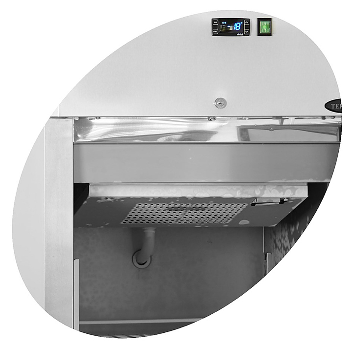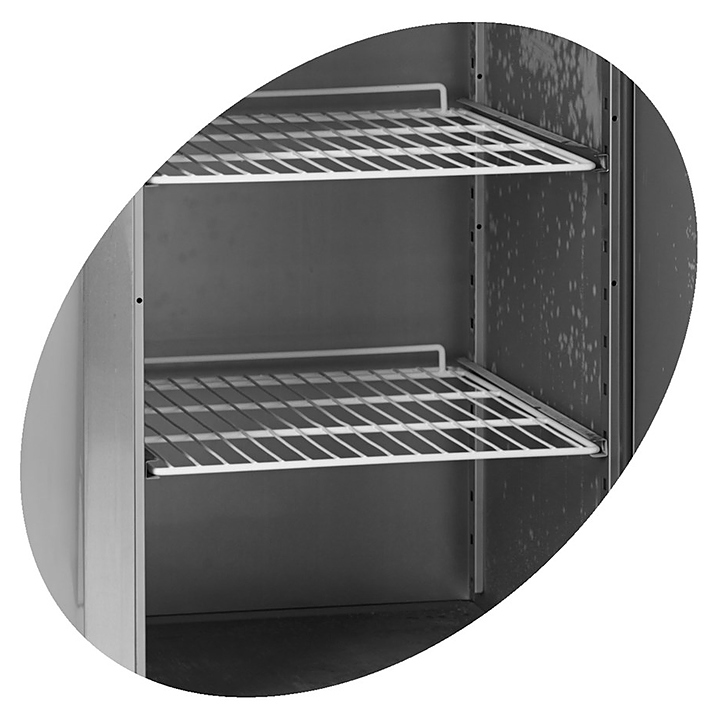 Морозильный шкаф TEFCOLD GUF70 предназначен для заморозки и длительного хранения продуктов, полуфабрикатов и мороженого на предприятиях общественного питания и торговли. Модель оснащена перенавешиваемой самозакрывающейся дверью с замком, 3 регулируемыми решетчатыми полками и 4 колесами, 2 из которых с тормозами. Корпус и внутренняя обшивка выполнены из нержавеющей стали SS201. Особенности: