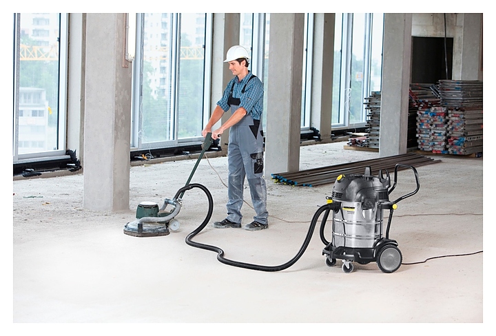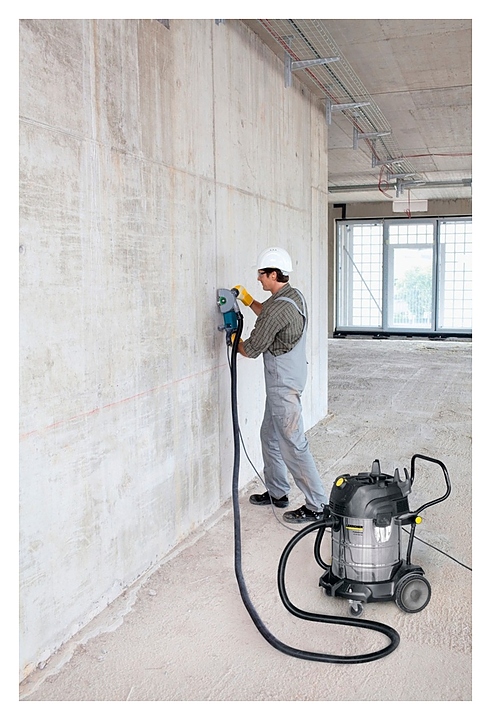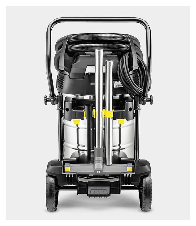 Профессиональный хозяйственный пылесос Karcher NT 75/2 Tact² Me предназначен для сухой и влажной уборки в ходе ремонтно-строительных или реставрационных работ, а также очистки мягкой мебели, автомобильных салонов, любых типов твердого и текстильного напольного покрытия в помещениях. Модель оснащена удобной рукоятью, крюками для шланга и кабеля, держателями для принадлежностей и устойчивым четырехколесным шасси. Корпус турбинной головки, держатели и насадки изготовлены из ударопрочного пластика, контейнер – из нержавеющей стали, удлинительные трубки – из хромированного металла, плоский складчатый фильтр и фильтр-мешок – из бумаги.