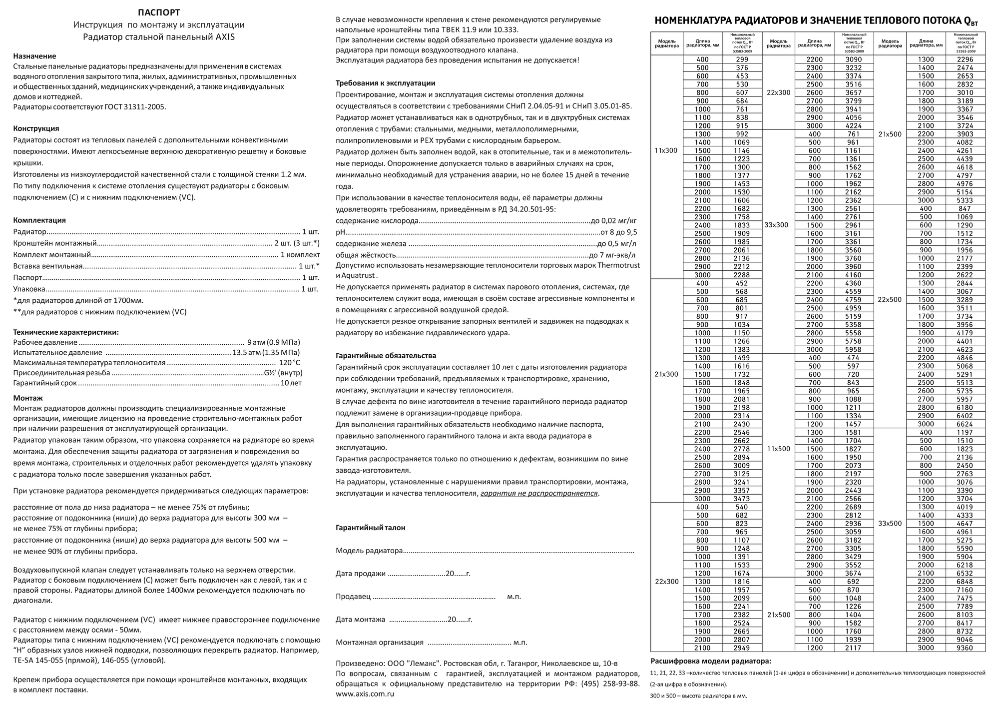 Радиатор Axis Classic 22 500x800 V используется для отопления жилых помещений, административных и общественных зданий. Модель состоит из 2 панелей с 2 секциями оребрения. В качестве теплоносителя могут использоваться вода и незамерзающие теплоносители Thermotrust и Aquatrust. Панель выполнена из российской холоднокатной стали толщиной 1,27 мм с антикоррозийной обработкой, окрашенной устойчивой к внешним воздействиям ярко-белой краской. Прибор изготовлен на итальянском оборудовании Leas. В комплект поставки входят 2 монтажных кронштейна, встраиваемый клапан Danfoss RA-N 013G1382, монтажный комплект (заглушка ½", воздухоотводчик ½") и паспорт радиатора. Особенности: