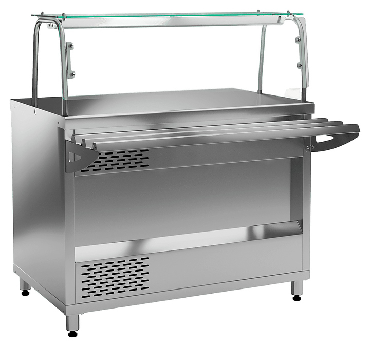 Прилавок-витрина МХМ ПВХЭ110 используется в составе линии раздачи Шеф 1120 для демонстрации и кратковременного хранения готовых блюд, продуктов питания, напитков и посуды на предприятиях общественного питания и торговли. Модель оснащена охлаждаемой столешницей, полкой и диодной подсветкой. Корпус выполнен из нержавеющей стали. Особенности: