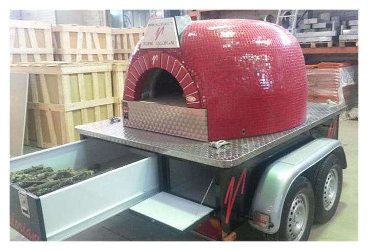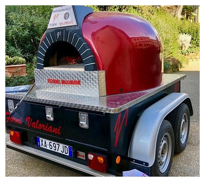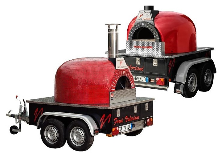 Мобильная дровяная печь Valoriani Trailer 120 используется в местах уличной торговли и предприятий общественного питания, во время проведения фестивалей, праздников и других массовых мероприятий на открытом воздухе для выпечки пиццы, хлеба и пирогов, приготовления шашлыка и гриль-блюд, обжарки, тушения и запекания по рецептуре, основанной на томлении и длительной выдержке при медленно падающей температуре. Печь оснащена декоративной дверной аркой, в прицепе имеются вместительные отсеки для хранения дров, дымохода, прочего необходимого оборудования и кулинарных ингредиентов. Элементы пода выполнены из огнеупорной натуральной глины с высоким содержанием глинозема, платформа прицепа, дымоход и колпак – из нержавеющей стали. В комплект поставки входят дымоход с защитным колпаком, подставка для безопасного размещения дров внутри печи и упаковка. Особенности: