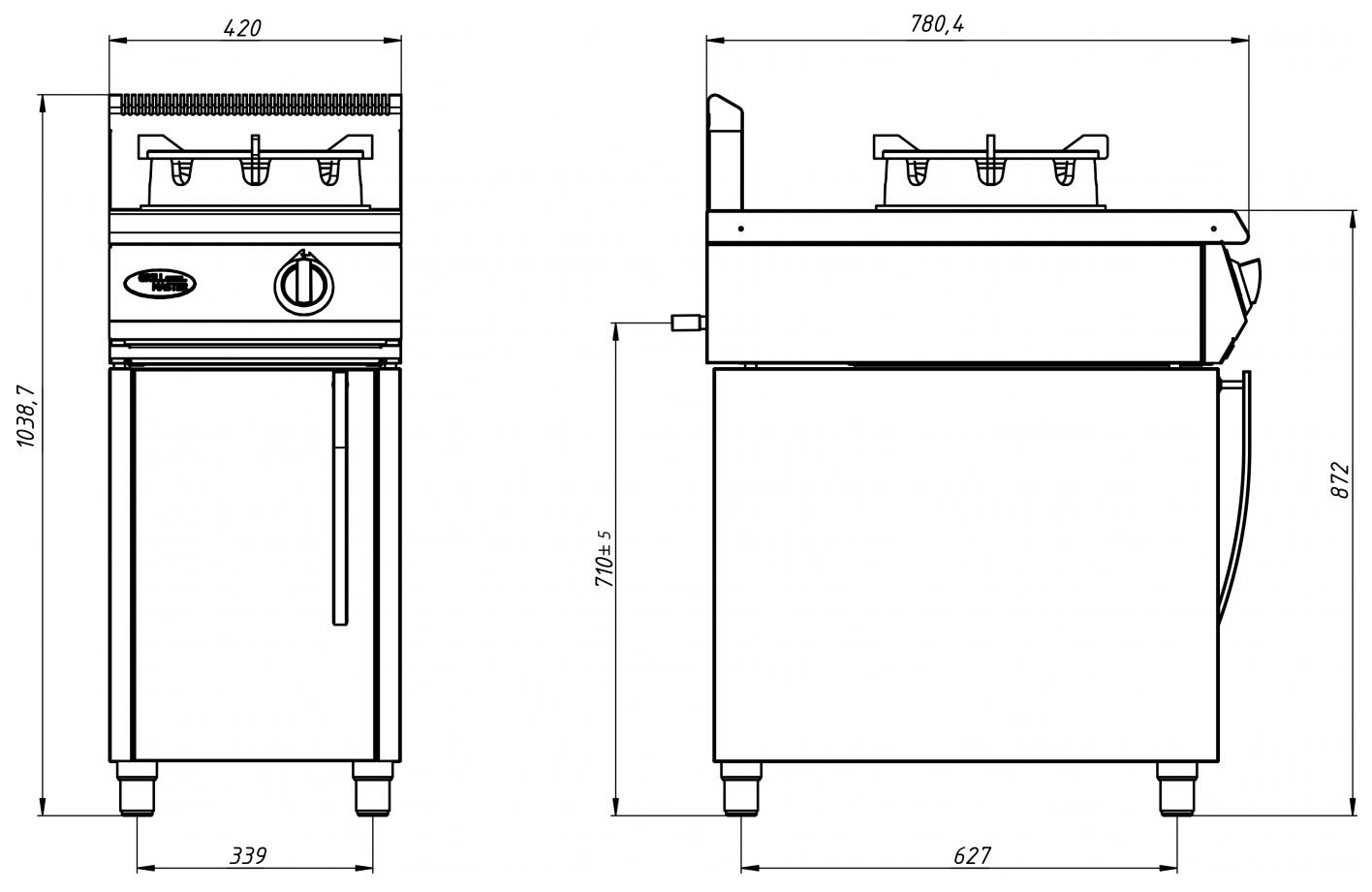 Газовая плита Grill Master Ф1ДГ/800 предназначена для приготовления широкого спектра блюд в WOK-сковородах на предприятиях общественного питания и торговли. Модель оснащена крупной горелкой повышенной мощности для сковород большого диаметра и закрытым стендом с дверцей. Корпус и разборный стенд выполнены из нержавеющей стали, горелки - из чугуна. Плита работает на магистральном и сжиженном газе. Модель настроена на метан, сопло на пропан входит в комплект поставки. Особенности: