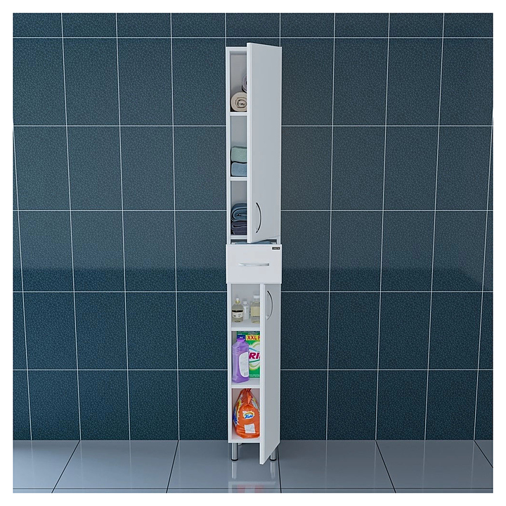 Шкаф-пенал СаНта Стандарт 24 дополнит интерьер ванной комнаты. Модель оснащена 2 распашными дверцами, 4 полками, выдвижным ящиком и ножками, защищающими конструкцию от воздействия влаги в случае намокания пола. Корпус выполнен из влагостойкой ЛДСП, фасад - из МДФ и покрыт ПВХ-пленкой для защиты от внешних воздействий. В комплект поставки входят 3 ручки, 2 хромированные и 2 пластиковые ножки. Особенности: