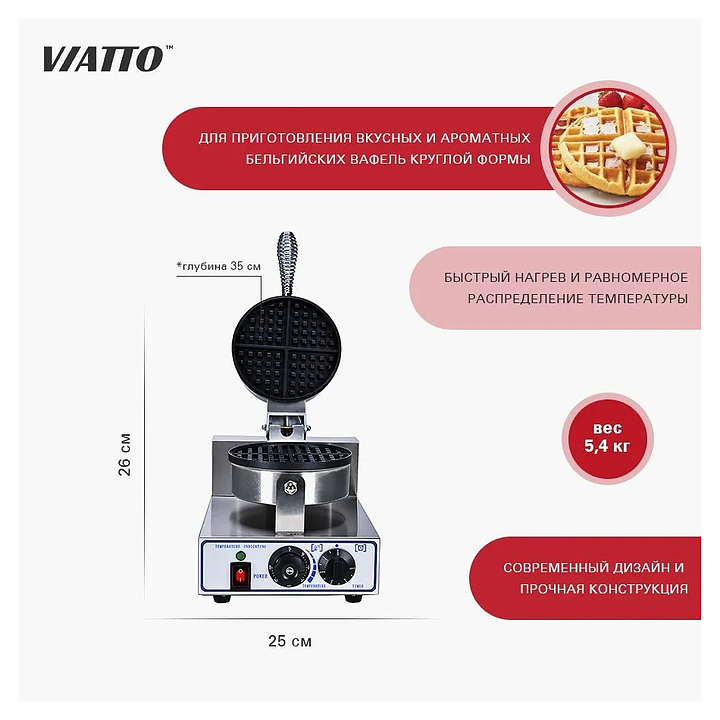 Вафельница VIATTO HWB-1 используется на предприятиях общественного питания и торговли для приготовления бельгийских вафель в форме четвертинок круга. Корпус выполнен из нержавеющей стали, жарочная поверхность - из алюминия с антипригарным покрытием. Дополнительные характеристики: