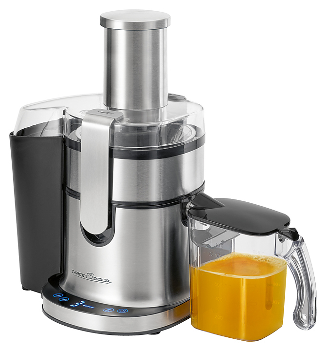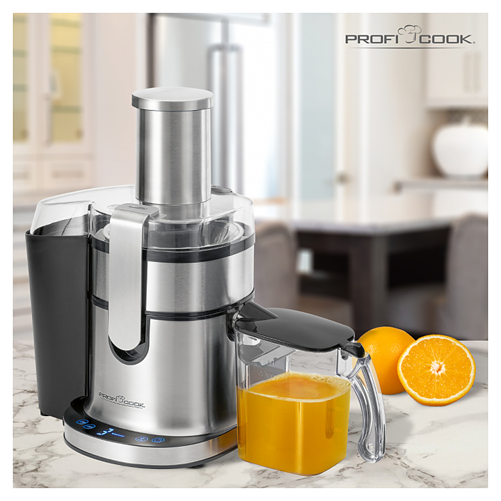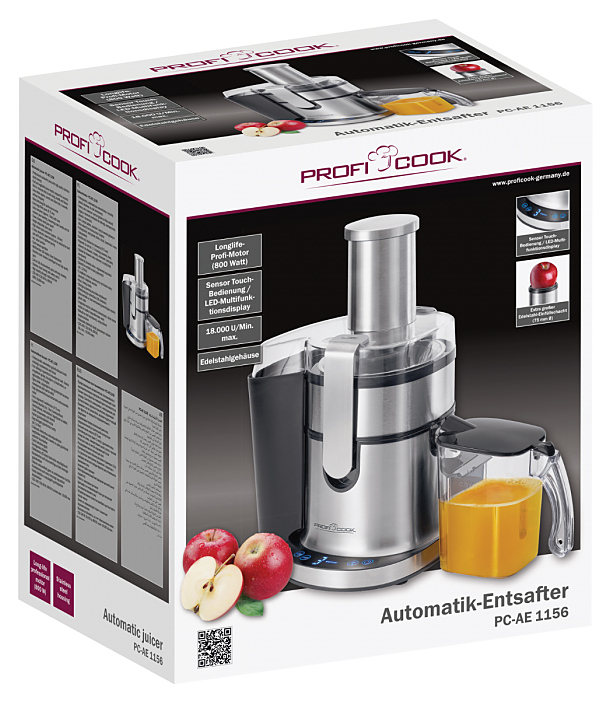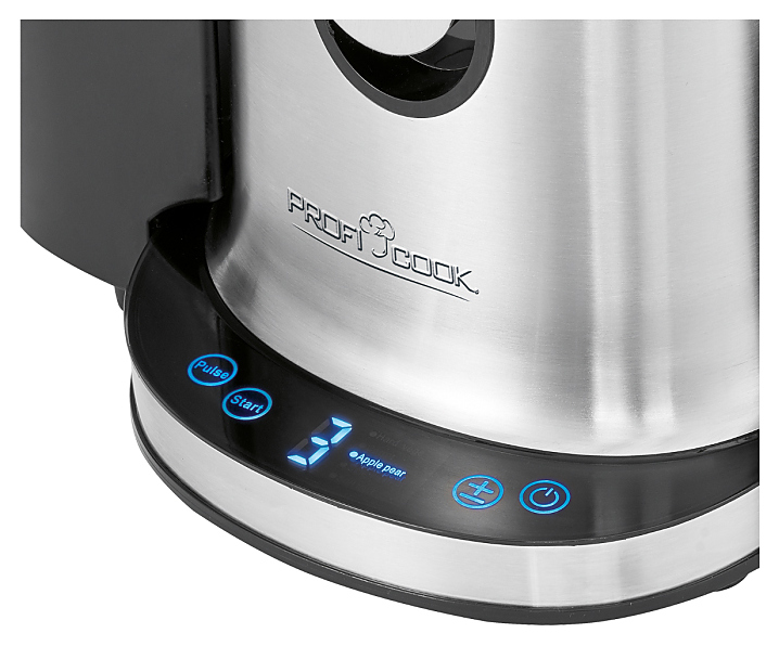 Cоковыжималка Profi Cook PC-AE 1156 предназначена для получения свежевыжатого сока яблок, моркови и других фруктов и овощей в частных домах, квартирах, отелях и офисах. Модель оснащена мощным двигателем, сенсорной панелью управления со светодиодным дисплеем с синей подсветкой и прорезиненными ножками с присосками. Корпус и микросито центрифуги выполнены из нержавеющей стали. В комплект поставки входит емкость для сока со скребком для пены, мерной шкалой, отверстием для наливания, ручкой и крышкой. Особенности: