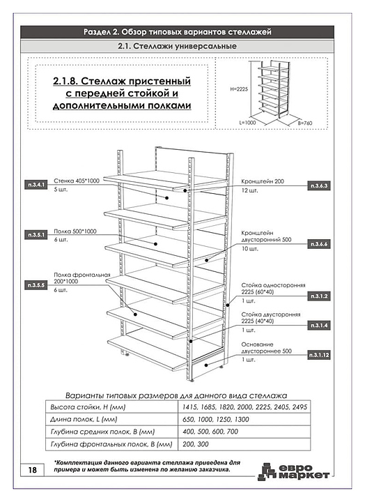 Дискаунтерный стеллаж с передней стойкой Евромаркет L=1000, H=2250, G=500 используется в продуктовых магазинах, супермаркетах, гипермаркетах и в других торговых помещениях для выкладки тяжелых товаров. Модель оснащена 5 полками и сплошной стенкой. Ценникодержатели, ограничители и цоколь в комплект поставки не входят и приобретаются отдельно. Для завершения линии стеллажей необходима дополнительная стойка. Особенности: