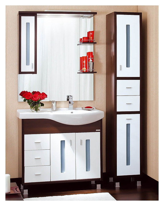 Зеркало БРИКЛАЕР Бали 90 выполнено в стиле модерн и отлично дополнит интерьер любой ванной комнаты. Благодаря подвесной конструкции модель не занимает много места, что позволяет экономить пространство в небольшой ванной комнате. Модель оснащена козырьком со светильником, закрытым шкафчиком с разделительными полками внутри, а также 2 открытыми полочками с ограничителями. Корпус выполнен из ламинированной влагостойкой ДСП, фасад - из МДФ с покрытием краской, ручки - из хромированного металла с тонким защитным слоем, устойчивым к механическим повреждениям. Зеркальное полотно покрыто серебром с амальгамой, благодаря чему в период эксплуатации зеркало не деформируется, а отражение не искажается. В комплект поставки входят навески для крепления к стене, 2 металлических ограничителя полок, 2 галогеновых светильника со сменными лампами 12 V, выключатель с розеткой и электрический провод 0.5 м для подключения к электросети 220 В, металлическая ручка и петли с доводчиками. Особенности: