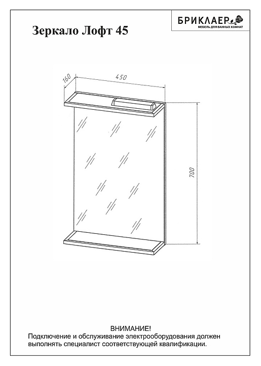 Зеркало БРИКЛАЕР Лофт 45 выполнено в эко-стиле и отлично дополнит интерьер любой ванной комнаты. Модель оснащена светильником и открытой полочкой для хранения ванных принадлежностей. Благодаря подвесной конструкции модель не занимает много места, что позволяет экономить пространство в небольшой ванной комнате. Корпус выполнен из ламинированной влагостойкой ДСП, отличающейся влагостойкостью, прочностью, устойчивостью к перепадам температурных режимов, способностью сохранять цвет и форму изделия в первозданном виде длительный срок, фасад - из МДФ, фурнитура - из металла. В комплект поставки навески для крепления к стене, петли с доводчиками, светильник и электрический провод 0,5 м для подключения к электросети 220 В. Особенности: