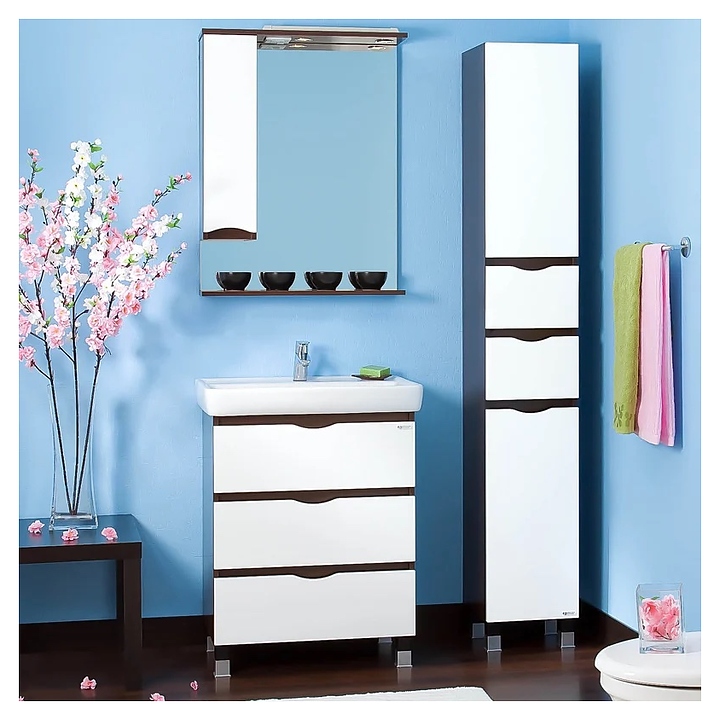 Зеркало БРИКЛАЕР Токио 80 выполнено в стиле японского минимализма и отлично дополнит интерьер любой ванной комнаты. Благодаря подвесной конструкции модель не занимает много места, что позволяет экономить пространство в небольшой ванной комнате. Модель оснащена козырьком с 2 врезными галогеновыми светильниками, а также небольшим закрытым шкафчиком с распашной дверцей и 2 стеклянными полочками внутри для хранения ванных принадлежностей. Корпус выполнен из ламинированной влагостойкой ДСП, фасад - из МДФ. Зеркальное полотно покрыто серебром с амальгамой, благодаря чему в период эксплуатации зеркало не деформируется, а отражение не искажается. В комплект поставки входят навески для крепления к стене, 2 галогеновых светильника со сменными лампами 12 V, выключатель с розеткой, электрический провод 0.5 м для подключения к электросети 220 В и петли с доводчиками. Особенности: