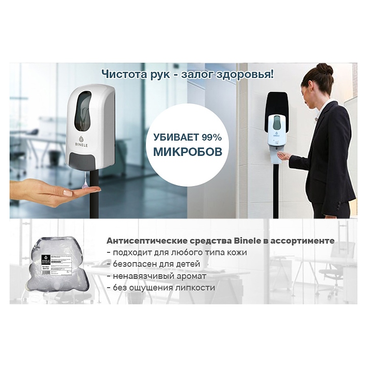 Комплект мобильной стойки для дезинфекции рук BINELE SF05AB используется совместно с диспенсерами eSoap DE12BW, eSoap DE12BB, eSpray DE13BB, eSpray DE13BW, iSoap DE22BW, iSoap DE22BB, iSpray DE23BW, iSpray DE23BB на предприятиях общественного питания и торговли, в офисах, кинотеатрах, образовательных и медицинских учреждениях, а также в других местах общественного пользования для бесконтактного дозирования антисептика. Корпус диспенсера выполнен из прочного АБС-пластика. В комплект поставки входят стойка и сенсорный диспенсер с защитой от несанкционированного доступа. Особенности: