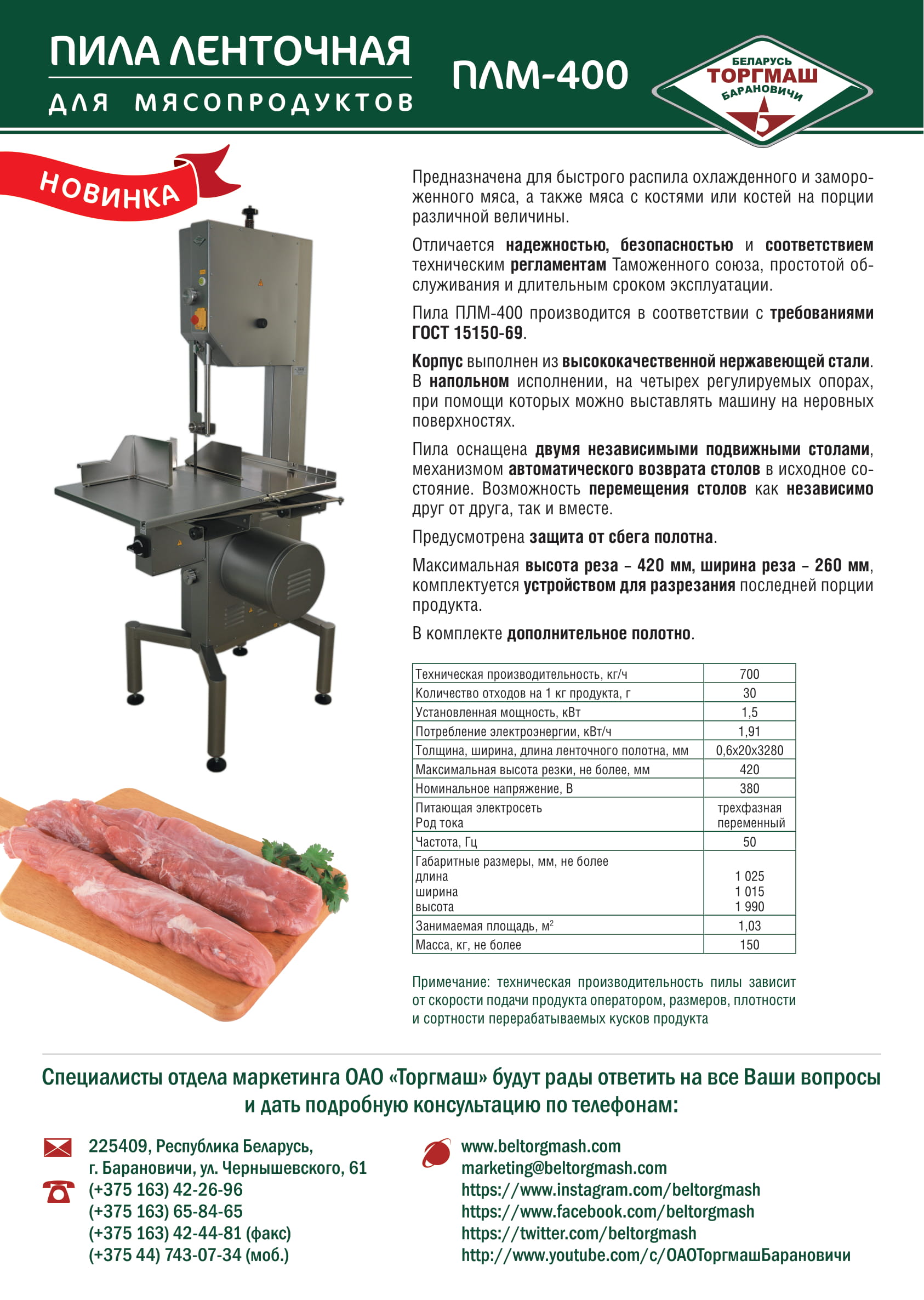 Ленточная пила БЕЛТОРГМАШ ПЛМ-400 предназначена для быстрого распила охлажденного и замороженного мяса, а также мяса с костями или костей на порции различной величины на предприятиях общественного питания, торговли, а также в производственных цехах гастрономических товаров. Модель оснащена столом с 2 независимыми подвижными секциями и ленточным полотном. Все компоненты выполнены из высококачественной нержавеющей стали. Комплектация: