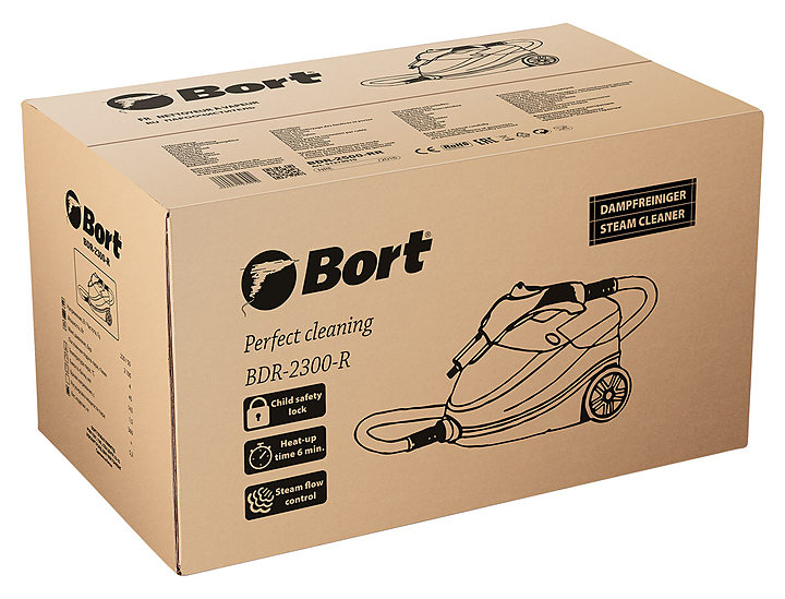 Пароочиститель Bort BDR-2300-R предназначен для обработки паром различных поверхностей в частных домах и квартирах. Модель оснащена электронной системой контроля уровня воды, индикатором нагрева, ручкой для переноски, 1 поворотным и 2 большими колесами. Корпус выполнен из пластика. Комплектация: