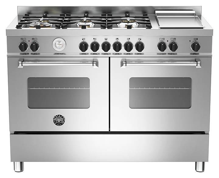 Варочный центр Bertazzoni MAS1206GMFEDXT предназначен для приготовления большого ассортимента блюд в гостиничном и ресторанном бизнесе, на предприятих пищевой промышленности, общественного питания и в домашних условиях. Модель оснащена комбинированной варочной поверхностью с задним бортом, основным и вспомогательным многофункциональными духовыми шкафами с откидными дверьми, горизонтальными рукоятками и обзорными окнами, выдвижным ящиком для хранения инвентаря и панелью управления с поворотными переключателями и фирменным аналоговым термометром. Корпус, варочная поверхность и опоры выполнены из нержавеющей стали, конфорки – из латуни, решетки – из чугуна, переключатели – из металла с мягким покрытием Soft Touch. В комплект поставки входят решетки, адаптер для посуды WOK и кольцо для кофейника. Режимы работы духовых шкафов: