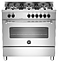 Варочный центр Bertazzoni MAS906MFESXE предназначен для приготовления большого ассортимента блюд в гостиничном и ресторанном бизнесе, на предприятих пищевой промышленности, общественного питания и в домашних условиях. Модель оснащена газовой варочной поверхностью с задним бортом, многофункциональными духовым шкафом с откидной дверью, горизонтальной рукояткой и обзорным окном, выдвижным ящиком для хранения инвентаря и панелью управления с поворотными переключателями. Корпус, варочная поверхность и опоры выполнены из нержавеющей стали, конфорки – из латуни, решетки – из чугуна, переключатели – из металла с мягким покрытием Soft Touch. В комплект поставки входят решетки, адаптер для посуды WOK и кольцо для кофейника. Режимы работы духового шкафа: