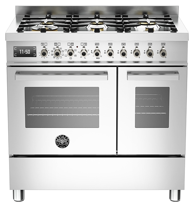 Варочный центр Bertazzoni PRO906MFEDXT предназначен для приготовления большого ассортимента блюд в гостиничном и ресторанном бизнесе, на предприятих пищевой промышленности, общественного питания и в домашних условиях. Модель оснащена комбинированной варочной поверхностью с задним бортом, основным и вспомогательным многофункциональными духовыми шкафами с откидными дверьми, горизонтальными рукоятками и обзорными окнами, выдвижным ящиком для хранения инвентаря и панелью управления с поворотными переключателями и сенсорным цифровым дисплеем. Корпус, варочная поверхность и опоры выполнены из нержавеющей стали, конфорки – из латуни, решетки – из чугуна, переключатели с металлическим покрытием.