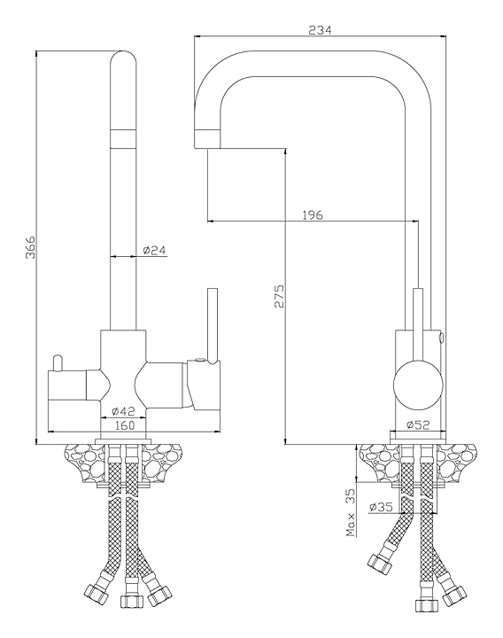 Смеситель для раковины Rossinka Z35-29 предназначен для подачи горячей и холодной воды в кухонных помещениях. Модель оснащена подключением к фильтру с питьевой водой и керамическим картриджем, обеспечивающим плавный ход рычага смесителя, контроль и точность при выборе напора и температуры воды. Пластиковый аэратор экономит расход воды, уменьшает шум, снижает количество брызг и отличается легкой очисткой. Изделие выполнено из латуни, отличающейся прочностью, долговечностью и устойчивостью к перепадам температур. В комплект поставки входят 3 подводки и переходник для шланга. Особенности:
