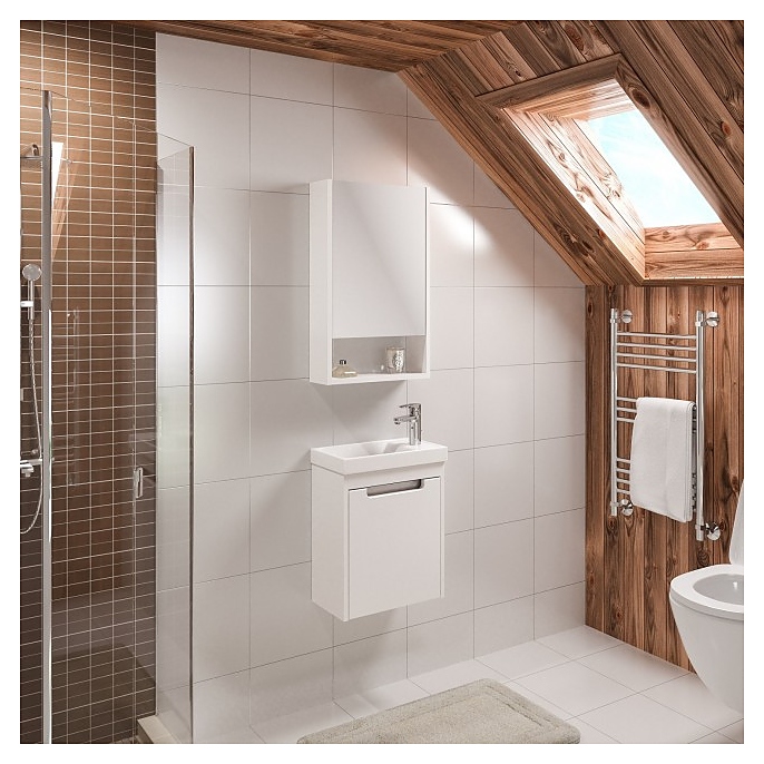 Зеркальный шкаф Runo Микра 40 выполнен в современном стиле и идеально впишется в интерьер любой ванной комнаты. Благодаря подвесной конструкции модель не занимает много места, что позволяет экономить пространство, а также облегчает уборку. Модель оснащена распашной дверью с 2 внутренними полками и открытой нижней полкой. Корпус выполнен из влагостойкой ЛДСП, фасад - из ЛДСП с матовой ламинацией. Особенности: