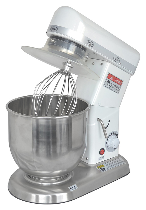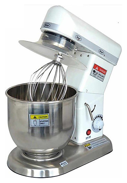 Планетарный миксер Hualian B10 предназначен для замеса различного вида теста жидкой консистенции, в том числе белкового, заварного, дрожжевого, бисквитного, а также для приготовления пюре, майонеза, различных соусов, взбитых сливок на предприятиях пищевой промышленности, общественного питания и торговли. Модель оснащена съемной дежей и месильным органом планетарного типа (по типу вращения). Дежа и все соприкасающиеся с продуктом элементы выполнены из нержавеющей стали. В комплект поставки входят венчик, лопатка, крюк и защитная крышка, предотвращающая разбрызгивание продуктов. Дополнительные характеристики: