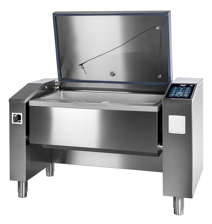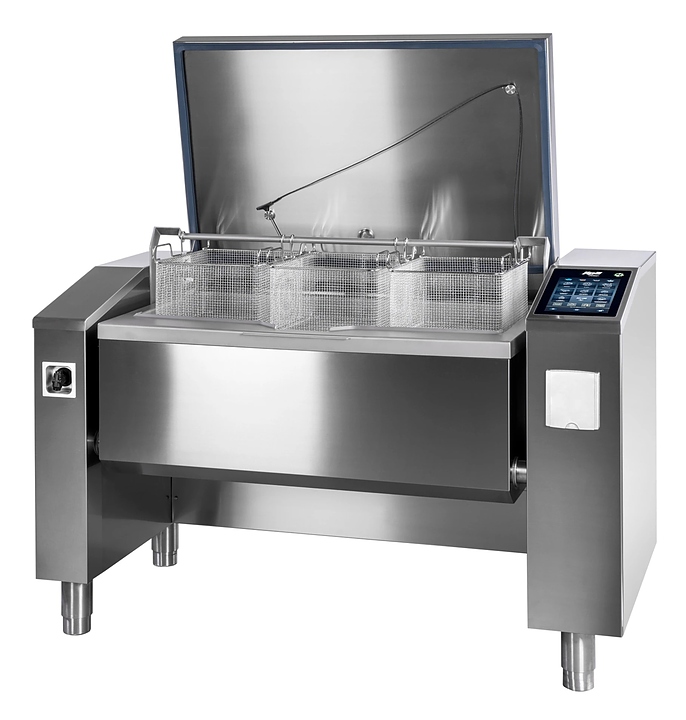 Опрокидывающаяся сковорода Jipa Jump 151 предназначена для приготовления мяса, рыбы, овощей и других продуктов различными способами на предприятиях общественного питания и торговли. Модель оснащена цветной сенсорной 10" панелью управления с русскоязычным интерфейсом, встроенным ручным душирующим устройством с возвратным механизмом и регулируемыми по высоте опорами. Корпус и рама выполнены из нержавеющей стали AISI 304, чаша - из нержавеющей стали AISI 316. В комплект поставки входят 3 корзины для варки, лопатка-скребок и сито для отделения твердой фракции от жидкой при наклоне чаши. Особенности: