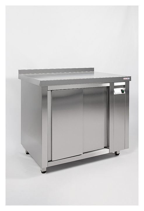 Тепловой стол Restoinox Т-СПЗК-12/6-Б используется для подогрева и хранения в подогретом виде посуды, готовых блюд и напитков перед подачей, а также в качестве рабочей поверхности для приготовления на предприятиях общественного питания и торговли. Модель оснащена расположенным сбоку нагревательным отсеком с панелью управления, обогреваемыми столешницей с задним бортом и камерой с дверьми-купе. Корпус, столешница и полка выполнены из высококачественной шлифованной нержавеющей стали AISI 430, опоры – из квадратного профиля стальной трубы AISI 430. Особенности: