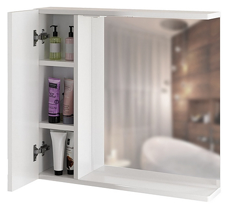 Зеркальный шкаф Mixline Квадро-75 выполнен в современном стиле и прекрасно дополнит интерьер любой ванной комнаты. За счет подвесной конструкции изделие позволяет экономить пространство в ванной комнате и облегчает уборку. Модель оснащена зеркалом, 1 открытой полкой, подсветкой с точечной светодиодной лампой, 1 распашной дверцей с металлической ручкой и 2 полками в отделении. Корпус изделия выполнен из ЛДСП, фасады - из МДФ с пленкой ПВХ. Комплект поставки: