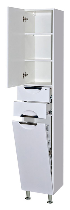 Шкаф-пенал Misty Орхидея-35 выполнен в современном стиле. Напольная конструкция обеспечивает легкий монтаж и не требует специального ремонта в помещении. Модель оснащена закрытым отделением с распашной дверцей и полками внутри, отделением с больевой корзиной, а также 2 выдвижными ящиками с шариковыми направляющими. Корпус изделия выполнен из ЛДСП, которая отличается влагостойкостью, прочностью, устойчивостью к перепадам температурных режимов, способностью сохранять цвет и форму изделия в первозданном виде длительный срок, фасад - из МДФ с эмалевым покрытием, полки - из ЛДСП. Шкаф-пенал является частью гарнитура для ванной комнаты Орхидея. Комплектация: