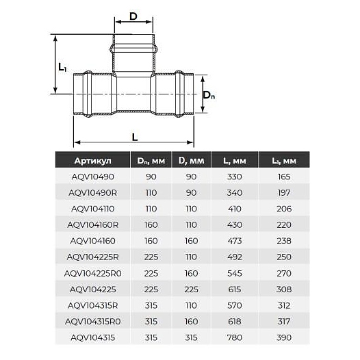 Тройник Aquaviva НПВХ серый SDR26 Дн 110х110х90гр Ру10 раструбный напорный в/к