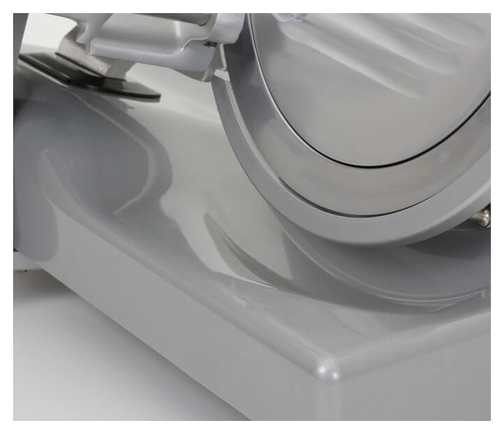 Слайсер RGV Lusso 275 S Prof предназначен для нарезки мяса, сыров, колбасных изделий, хлеба и других гастрономических изделий на ровные ломтики на предприятиях общественного питания, торговли и пищевой промышленности. Модель оснащена наклонным дисковым ножом. Основание выполнено из алюминия, покрытого пригодной для контакта с пищевыми продуктами краской, лезвие – из закаленной шлифованной стали с твердым хромированным покрытием, крышка ножа, лоток для продуктов и перегородка для регулировки нарезки – из анодированого алюминия с полированным покрытием, защитный экран – из плексигласа. Особенности:
