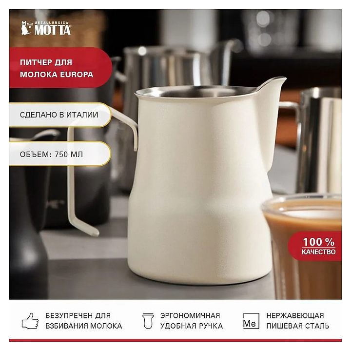 Молочник MOTTA Europa на 750 мл используется совместно с кофемашинами и кофеварками на предприятиях общественного питания и торговли, в частных домах и квартирах для взбивания молока при приготовлении кофейных напитков. Модель оснащена удобной ручкой. Изделие выполнено из нержавеющей стали, покрытой ударопрочной эмалью белого цвета. Дополнительные характеристики: