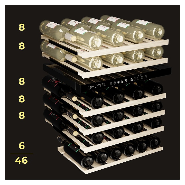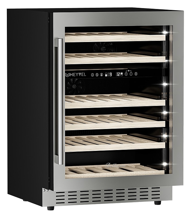 Винный шкаф MEYVEL MV46PRO-KST2 предназначен для демонстрации, хранения и создания оптимальных условий для сохранения всех вкусовых свойств вина в бутылках на предприятиях общественного питания, торговли, в барах, ресторанах, специализированных магазинах, частных домах или квартирах. Модель оснащена сенсорной панелью управления, электронным термостатом, белым демонстрационным и панорманым освещением. Корпус и ручка выполнены из стали, дверь - из стальной рамы и тройного стекла с защитой от ультрафиолетовых лучей, полки - из массива бука. В комплект поставки входят петли для перенавешивания двери. Особенности: