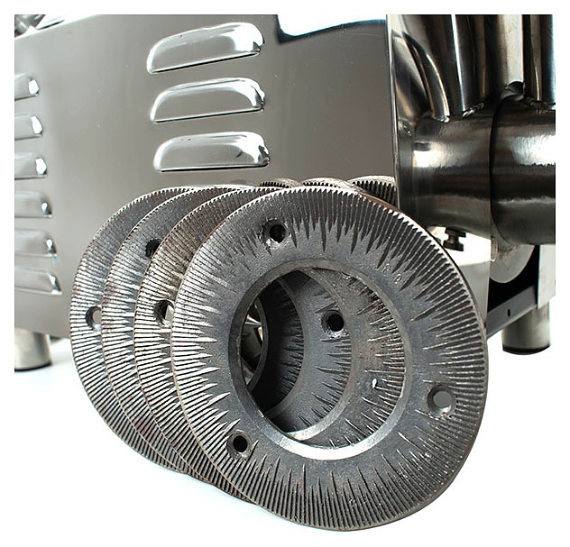 Жерновая мельница Foodatlas HR-1500(A) предназначена для измельчения сухих пищевых продуктов в муку или пудру на предприятиях общественного питания и торговли. Модель оснащена контрольной панелью управления с цветовой маркировкой кнопок и подписями, системой охлаждения электродвигателя и жерновами вогнутой формы. Корпус и приемочный бункер выполнены из хромированной и окрашенной нержавеющей стали, жернова - из литого чугуна. В комплект поставки входит дополнительный набор дисков для замены в случае поломки. Особенности: