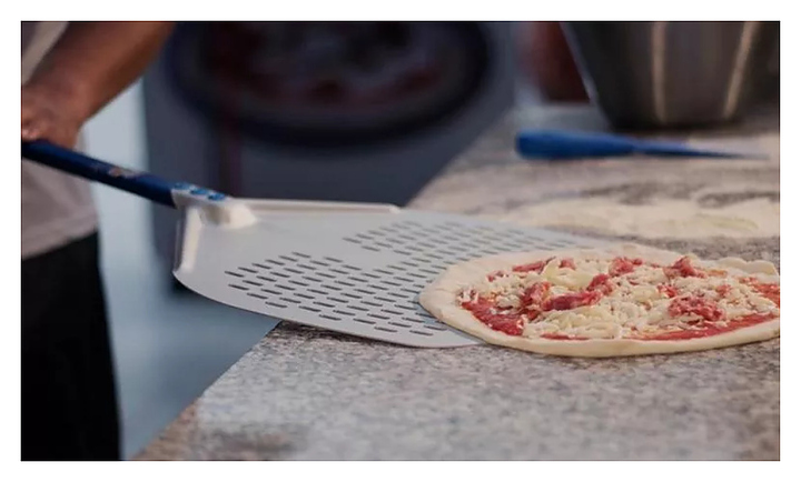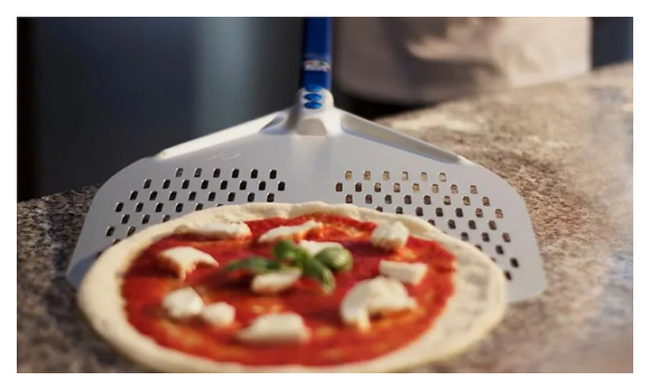 Лопата GiMetal A-50RF серии Azurra используется на предприятиях пищевой промышленности, общественного питания и торговли для загрузки, выгрузки и поворачивания в процессе приготовления в печи пиццы и других хлебобулочных изделий. Модель оснащена головкой прямоугольной формы и длинной рукояткой. Головка изготовлена из высококачественного нейтрально анодированного алюминия с выполненной методом лазерной проточки перфорацией, рукоятка и заклепки – из анодированного алюминия с покрытием лазурно-голубого цвета. Особенности: