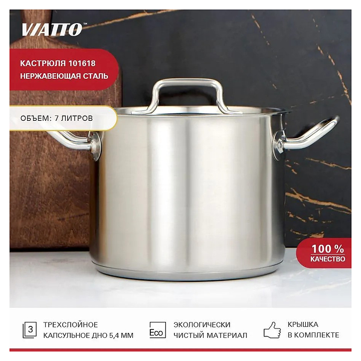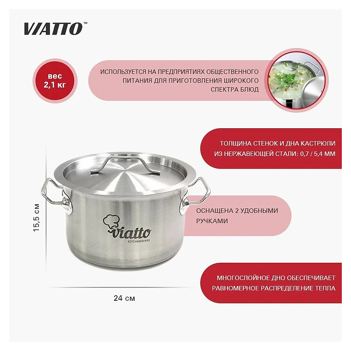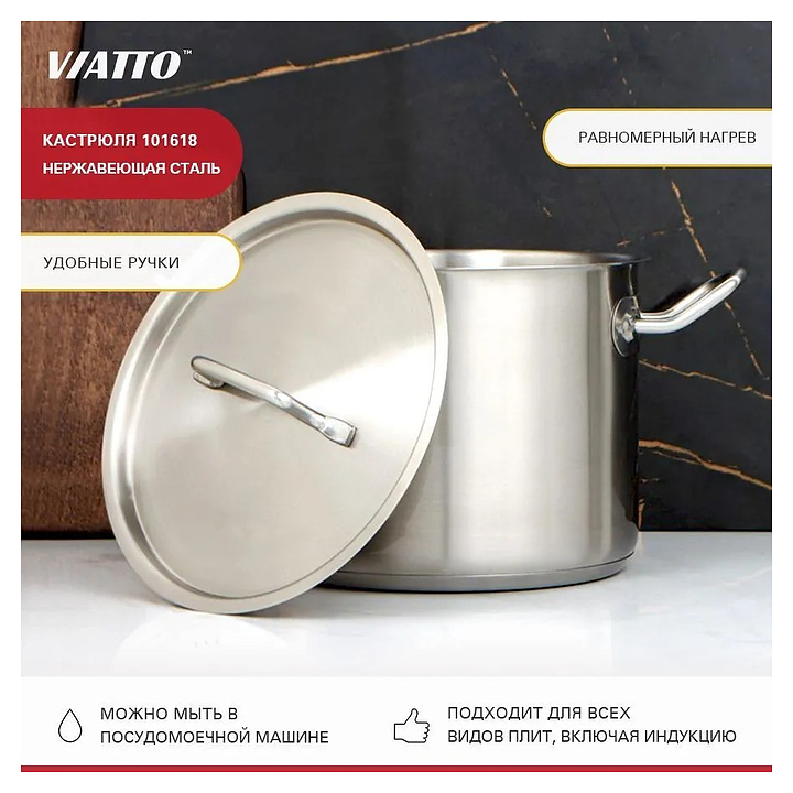 Кастрюля VIATTO 101618 используется на предприятиях общественного питания и торговли, в частных домах и квартирах для приготовления широкого спектра блюд. Изделие выполнено из нержавеющей стали, дно - тройное. В комплект поставки входит крышка. Характеристики: