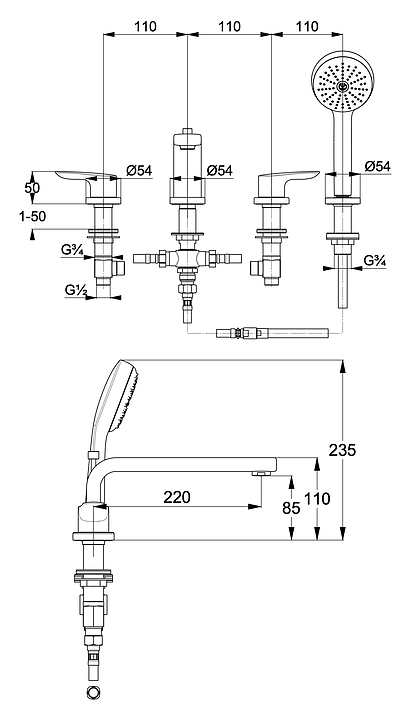 Смеситель на борт ванны KLUDI Pure&Solid 344230575 на 4 отверстия, хром