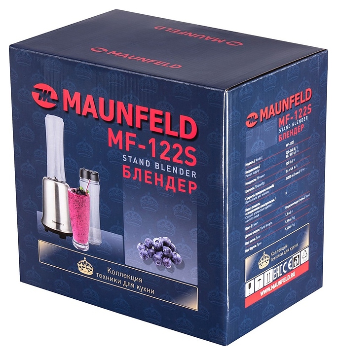Блендер Maunfeld MF-122S предназначен для измельчения пищевых продуктов и приготовления муссов, смузи, фраппе, соусов, коктейлей, фруктовых и овощных пюре на предприятиях общественного питания, а также в домашних условиях. Модель оснащена устойчивыми нескользящими опорами, кабелем питания с вилкой и электромеханической панелью управления. Корпус в форме колокола выполнен из нержавеющей стали с сатинированной поверхностью, стаканы – из пластика, фиксирующие крышки – из черного пластика, ножи – из высококачественной нержавеющей стали, упаковка – картонная коробка. Комплектация: