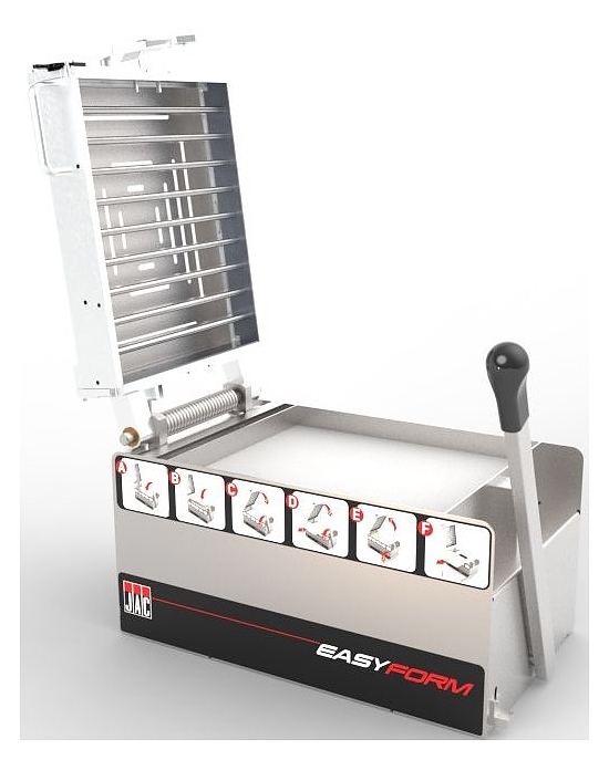 Делитель-формовщик Jac Easyform используется на предприятиях общественного питания и торговли для распределения всех видов теста и придания подходящей формы. Кювета, корпус и шасси изготовлены из нержавеющей стали. Особенности: