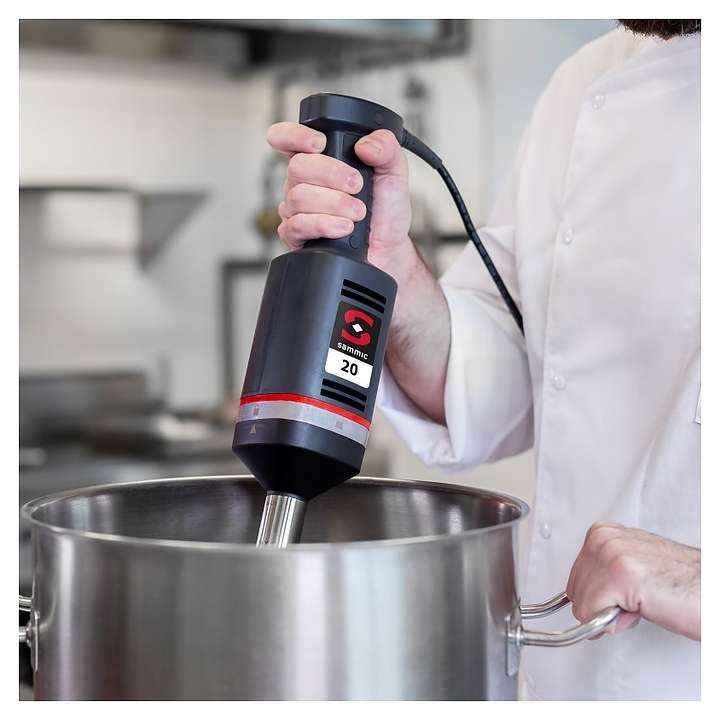 Погружной блендер Sammic XM-21 предназначен для взбивания, смешивания, измельчения продуктов питания на предприятиях общественного питания и торговли. Модель оснащена регулятором скорости, световым индикатором подключения к электросети и эргономичной противоскользящей ручкой. Y-образный нож с долговечной режущей кромкой выполнен из закаленной стали. Особенности: