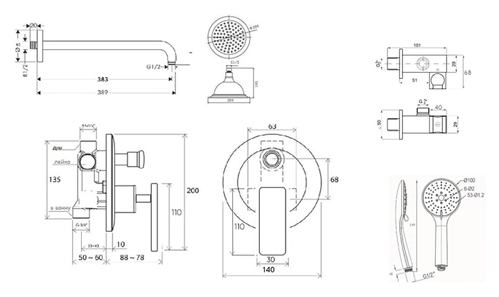 Комплект душевой Bronze de Luxe Pure A800/9143-2 встраиваемый, на 2 выхода, хром